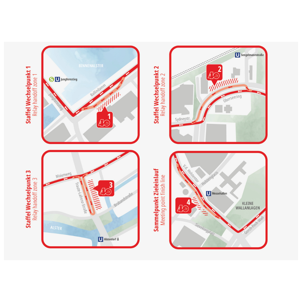 All exchange points are located near subway or suburban train stations, allowing relay runners 1–3 to easily reach the meeting point at “Am Sievekingplatz” (approximately 400 meters before the finish line) in time to join their team for a shared finish.