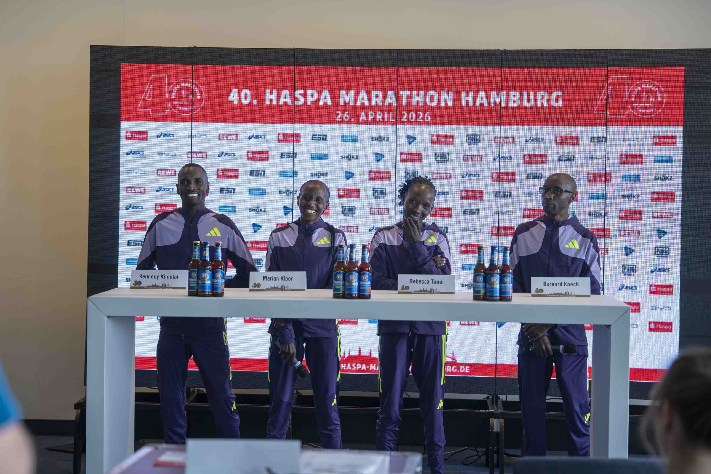 Bernard Koech, der zweifache Sieger des Haspa Marathon Hamburg, sein Trainingspartner Kennedy Kimutai sowie die ebenfalls aus Kenia kommenden Rebecca Tanui und Marion Kibor gehören zu den Top-Favorit:innen beim 40. Jubiläumsrennen des größten deutschen Frühjahrs-Marathons am Sonntag. Das starke kenianische Quartett, das heute bei einer Pressekonferenz im Hamburger Intercity Hotel vorgestellt wurde, ist bereit für ein schnelles Rennen.