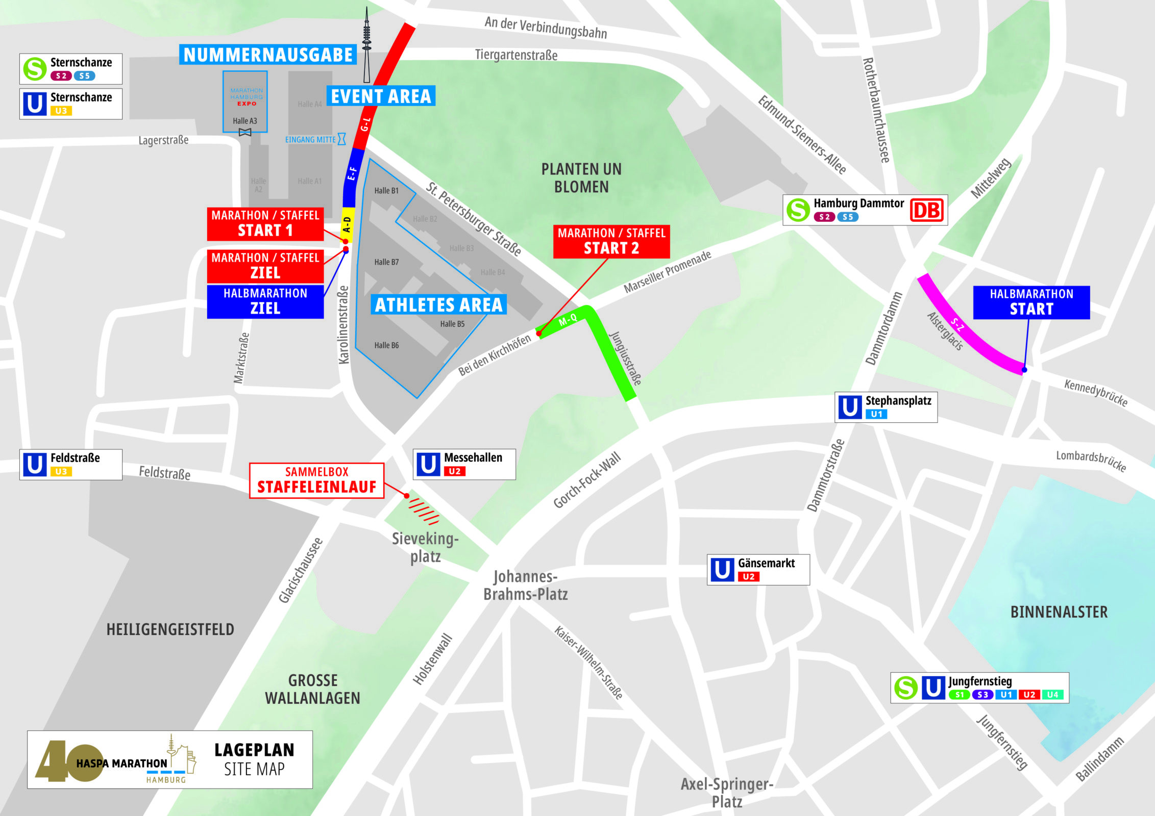 Zum Veranstaltungsgelände sowie zum Start und Ziel in der Karolinenstraße reist ihr am besten mit der S-Bahn oder U-Bahn U3 bis Sternschanze oder der U2 bis Messehallen an.